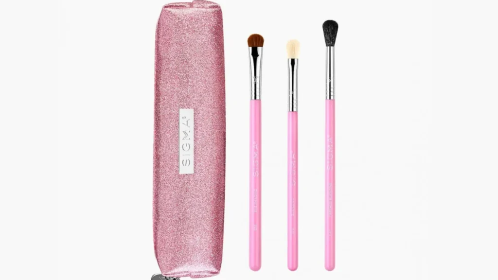 Sigma’s coral-pink collection features their exclusive SigmaTech fibers paired with lightweight wooden handles. These brushes are engineered for specific techniques—the foundation brush has a unique flat-top design, and the blending brushes are precisely shaped for seamless eye looks.