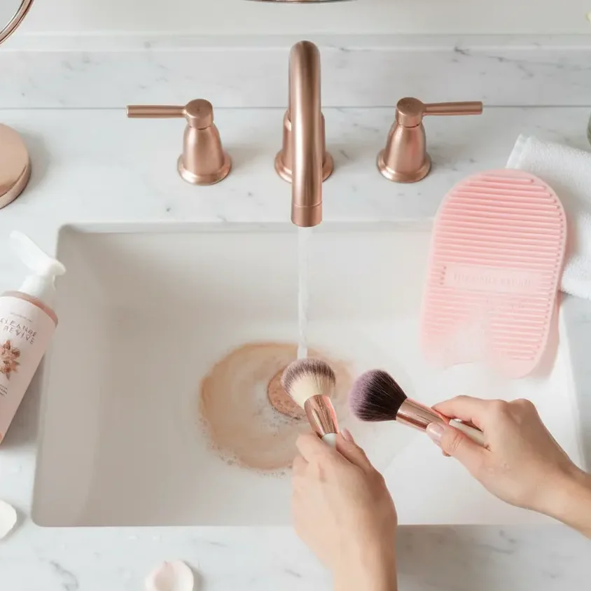 Step One: Rinse Bristles Downward. Begin by running your brush under lukewarm water, always pointing the bristles downward toward the sink. This directional rinsing is critical—water flowing into the ferrule (the metal part that holds the bristles) will loosen the adhesive and eventually cause your brush to shed or fall apart completely. Gently squeeze bristles as you rinse to release initial surface makeup and prepare them for deeper cleaning.